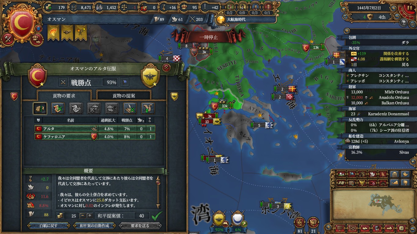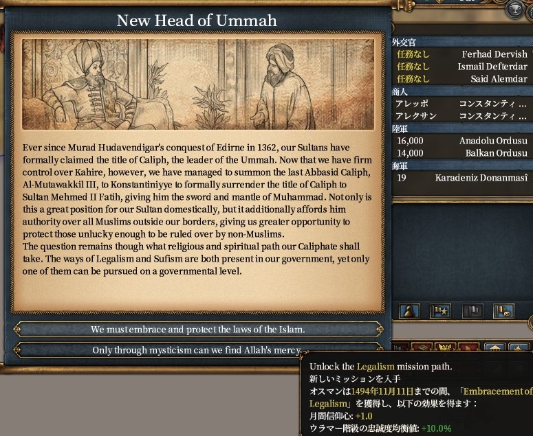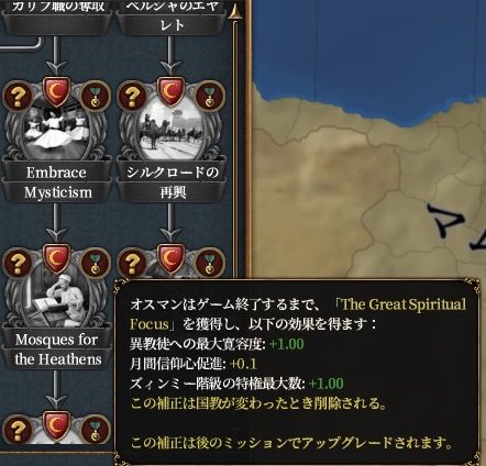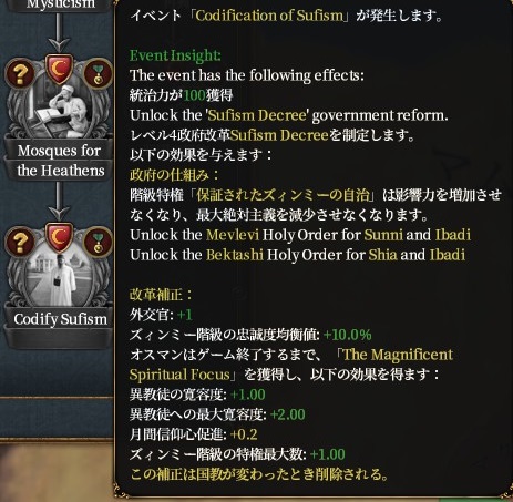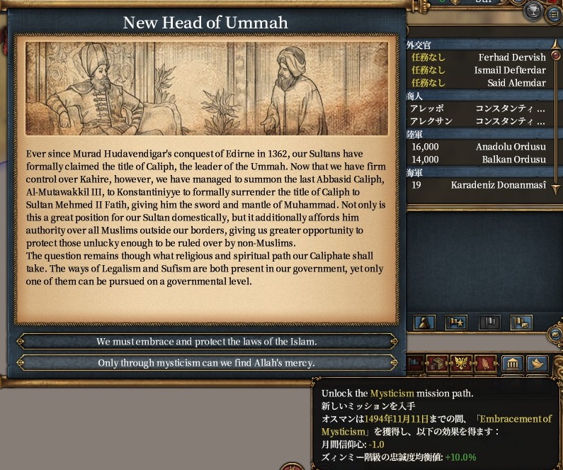 イスラムのままの場合、実績 Mehmet's Ambition にしても通常プレイにしても神秘主義(ズィンミー)ルート安定かなという印象です。