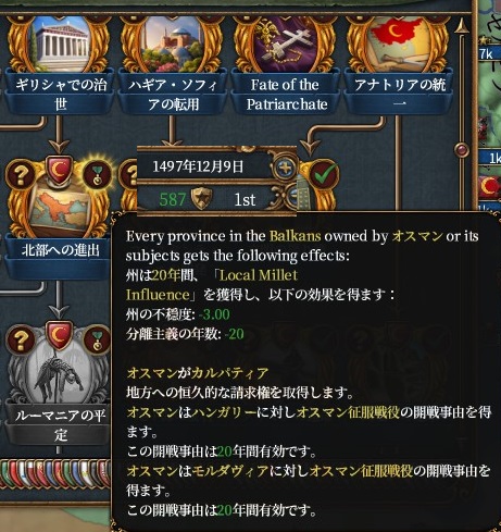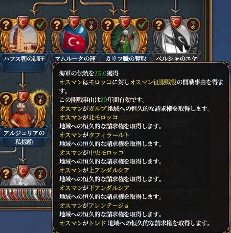 指揮官白兵+1、安定度コスト汚職減、陸軍維持費-5%、イェニチェリの規律+5%、忠誠特権,