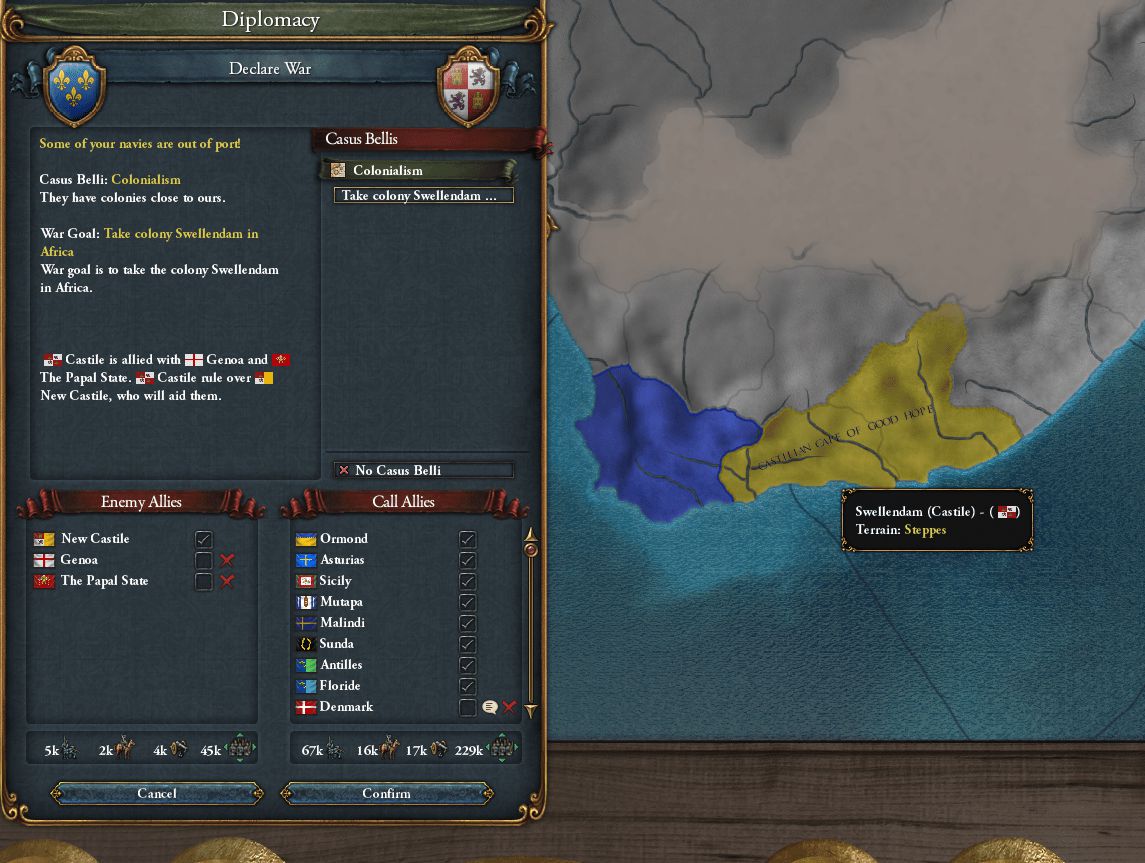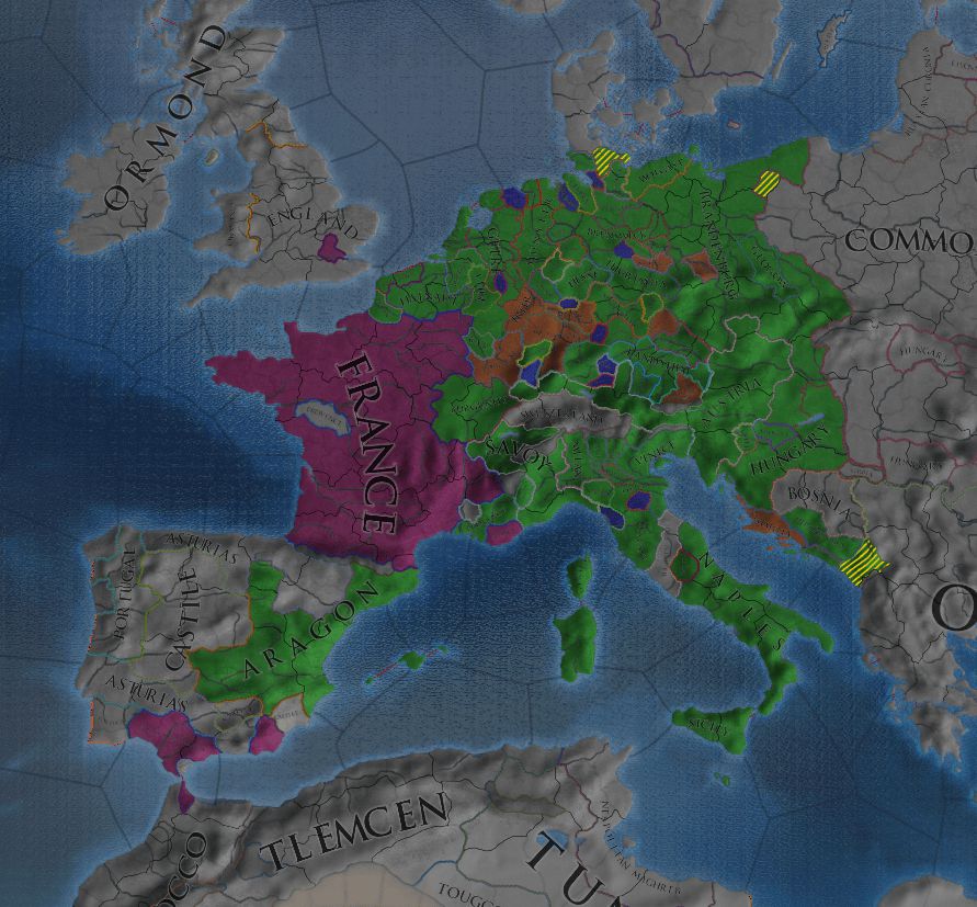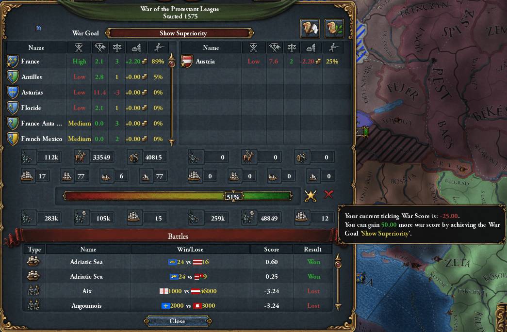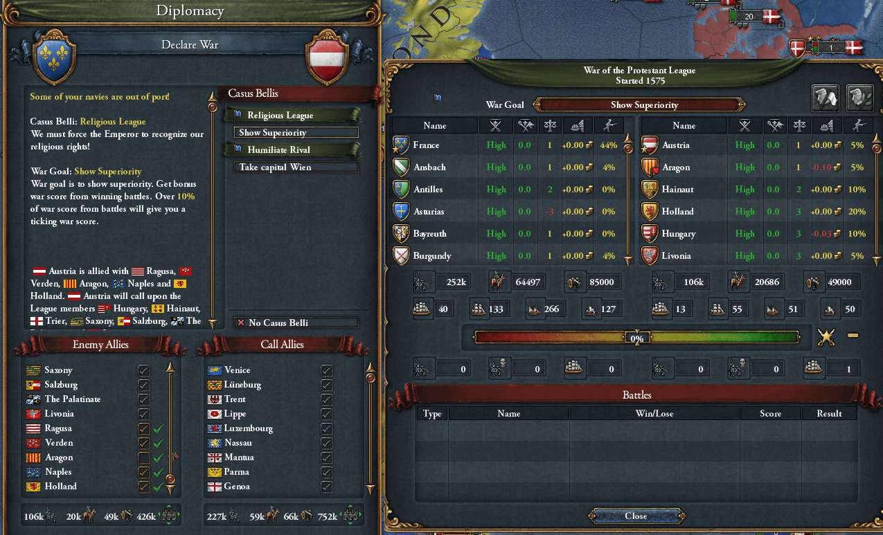 Aragon以外のAustriaの同盟国は共戦国に指定(追加参戦しそうな強国が居なかったので) 戦力的にはかなり優勢