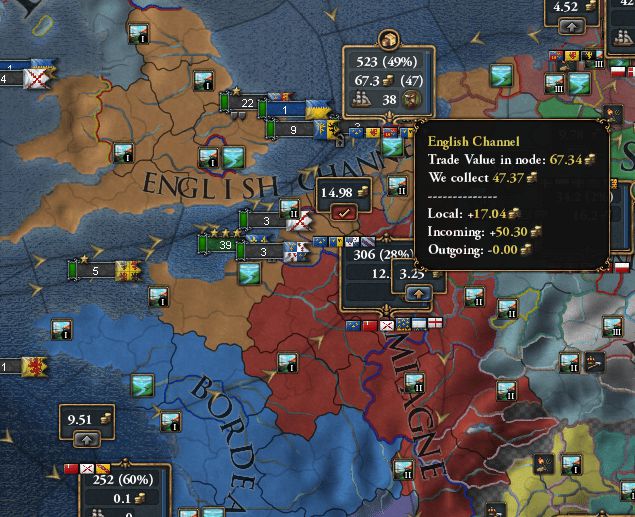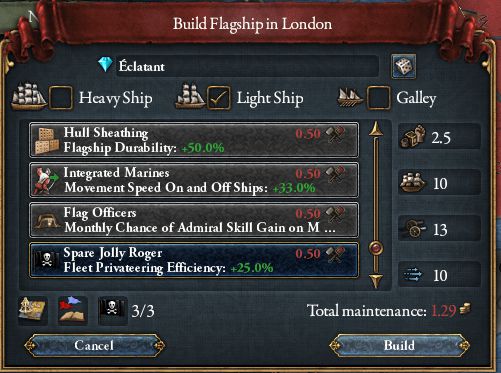 無理に大ブリテン島南部を征服せずとも大量の軽装艦で交易保護任務に当たらせれば、英国海峡ノードのシェアを上げられることにやっと気づいた それらの軽装艦を率いさせる旗艦を建造することにした。ボーナスは艦隊の1隻当たり交易力+1、艦隊移動速度+1、艦隊私掠効率+25%に振った 私掠効率が役立つ機会はしばらくないだろうが、英国海峡ノードを支配後は暇になるかと思ったのでつけておいた