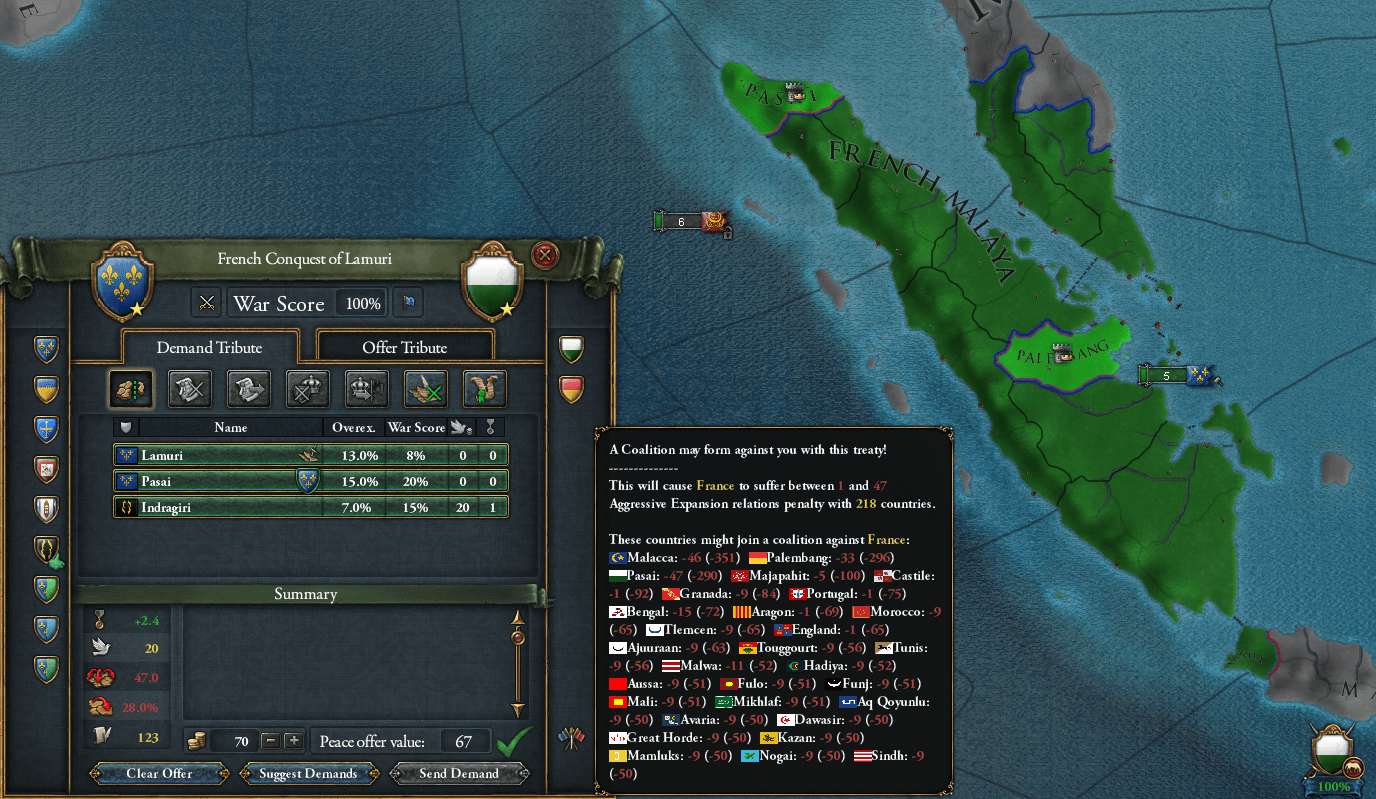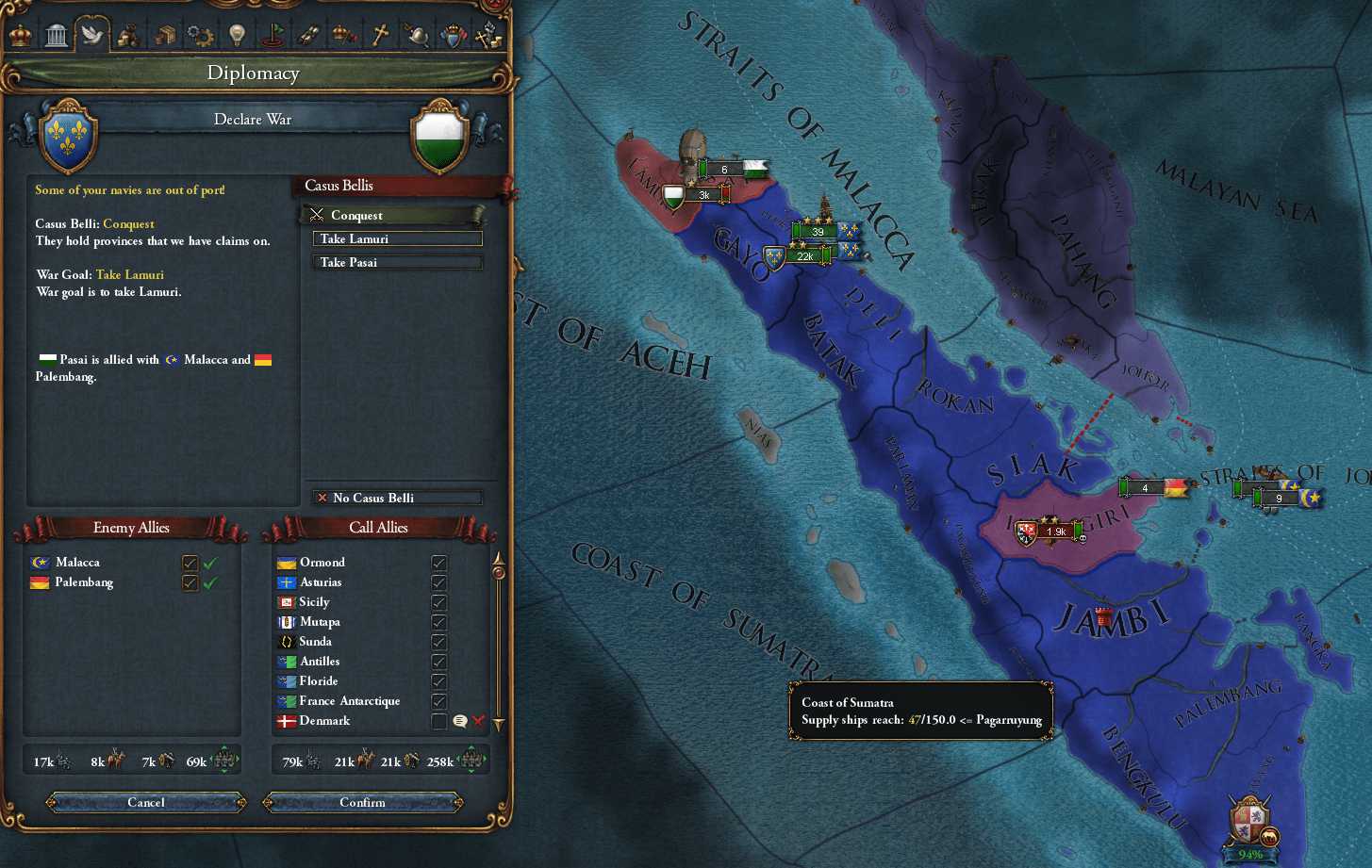 メインターゲットはMalacca。幸い同盟網が閉じていたのでPalembangと共に共戦国に指定した Castile戦はとっくに決着がついているのだが、Aragonがハイエナ参戦してきたので放置中 ハイエナ参戦って自分がするときは楽しいけど、AIにされるとやたらと腹が立って妨害したくなる