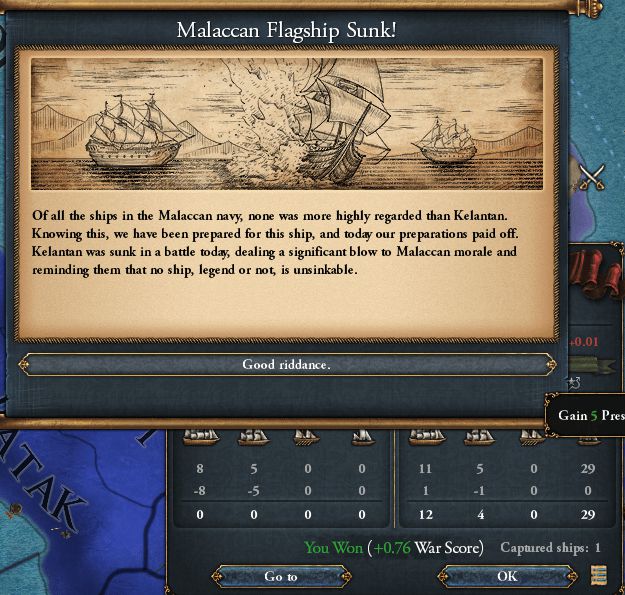 前回のEngland海軍との善戦でFrance海軍は強かったことが判明したので、積極的に海戦を仕掛けていた ちなみに少し前のBrunei戦でも敵重装艦4隻の内2隻撃沈2隻拿捕の戦果があった