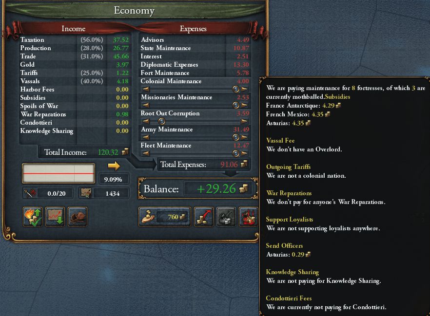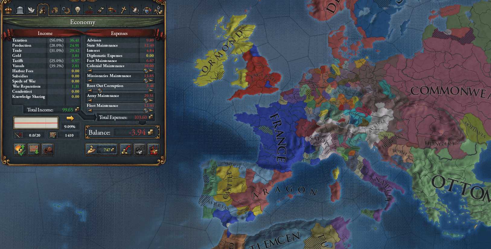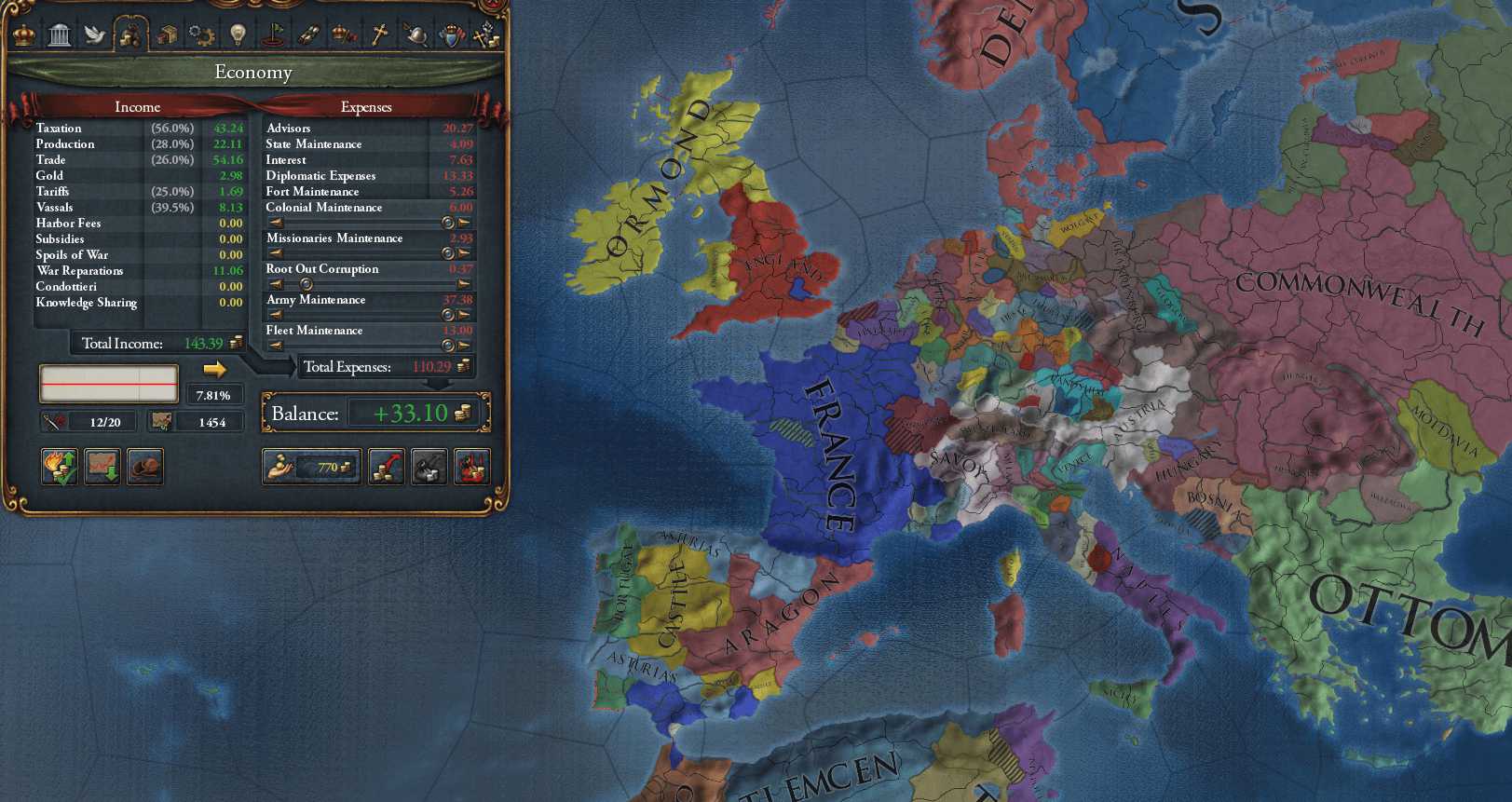 借金があり戦争疲弊も高いため、しばらく戦争の予定はない(インシデント除く) この後陸海軍の維持費を最低まで下げると、収支は+58.29ducatsの黒字となった