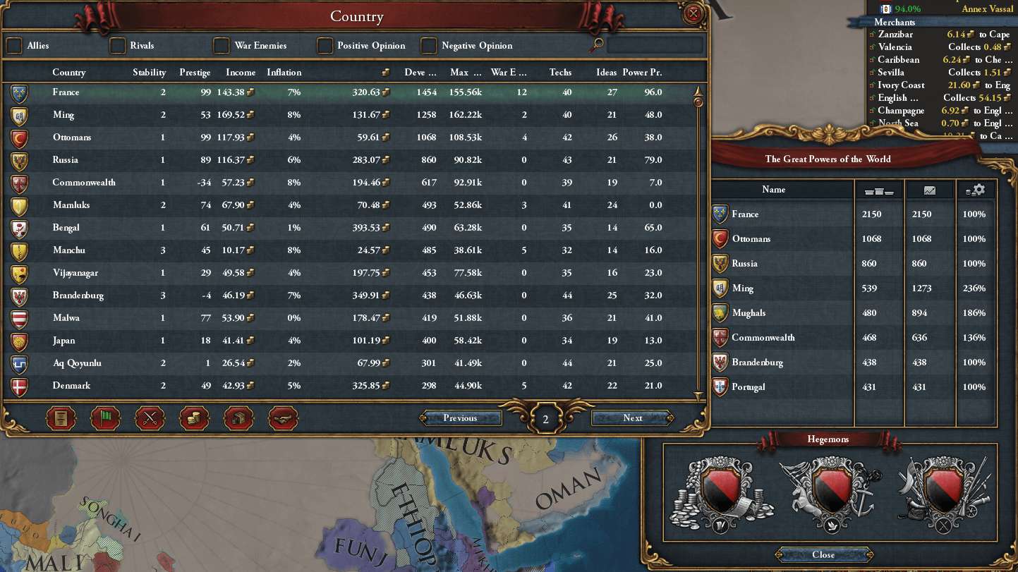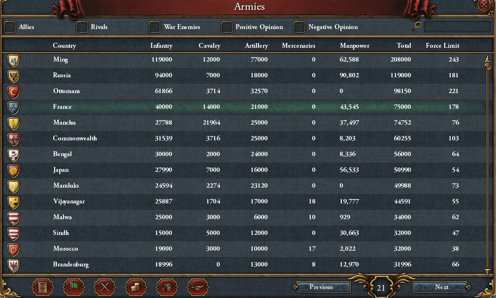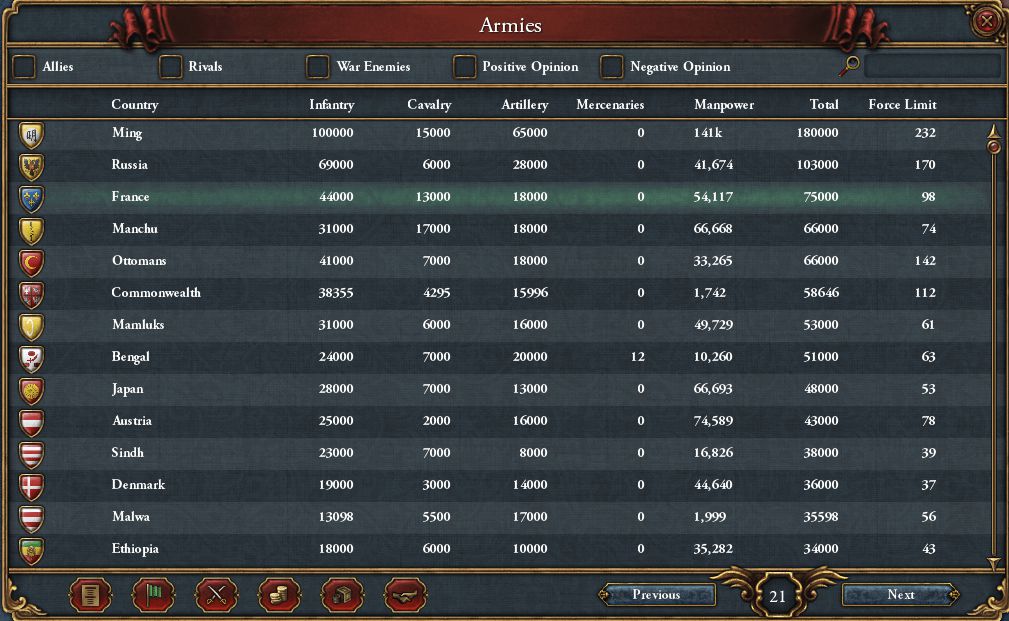 Mingは戦争もしないのにRussiaの倍近い兵力を保有しており、維持費が勿体なく感じる。その金で国内に投資しておいて欲しい インドはいい感じに中堅国がけん制しあっている。ここにもMughalsが居ない。外交枠が空いたらMughalsと同盟してインドを南部から切り取りたい