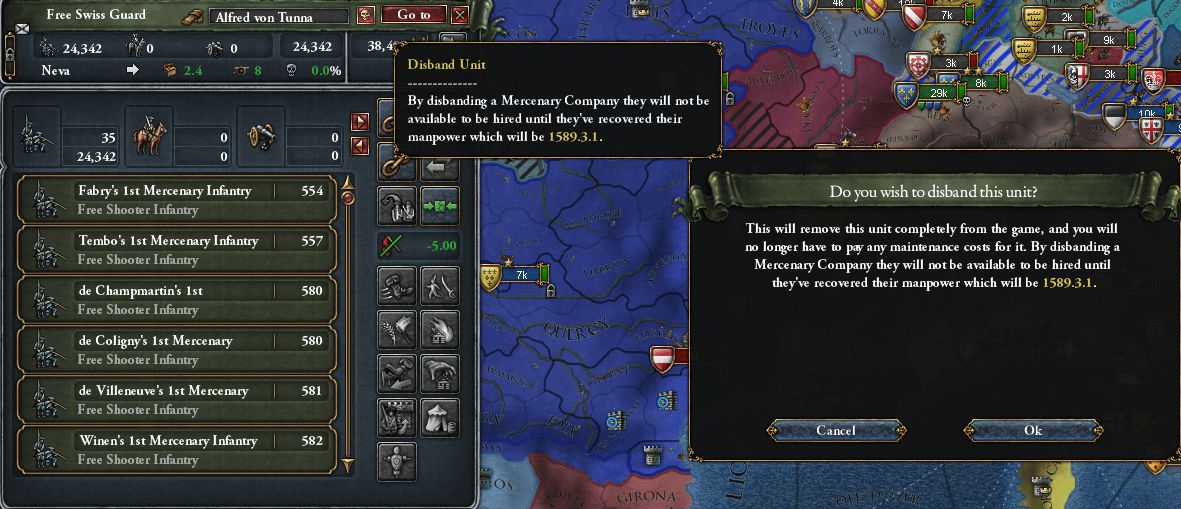 傭兵団を解雇後はその人的資源が回復するまで再雇用できない 雇用前の人的資源プールが77280だったため、40000弱(人的資源のみ)~50000強(部隊補充込み)の人的資源の回復に6年半かかっている 前者なら+6154/年、後者なら+7692/年の計算になる。傭兵団の規模(部隊テンプレートの連隊数)が変化する場合どうなるのだろうか?