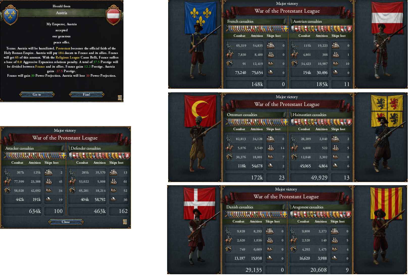 Russia/Commonwealth/Brandenburg/Englandなどが参戦しなかったため、犠牲者は両陣営合わせても1100k弱と少なめ 傭兵団を雇ったことが功を奏したのか、Franceの人的資源も59750→38286と温存できた