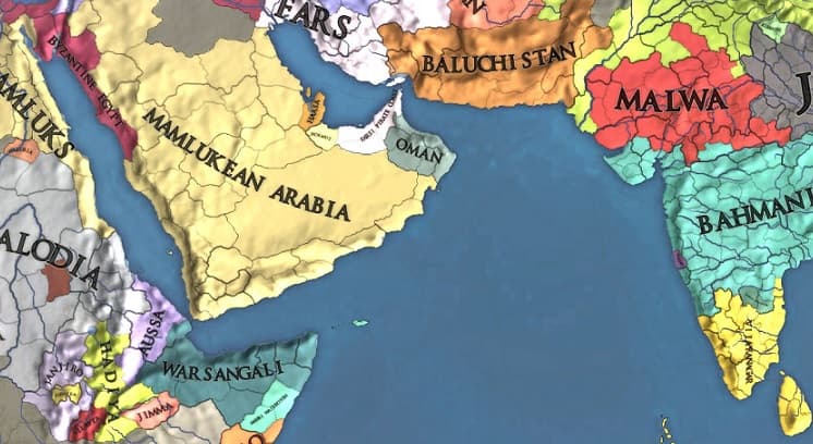 財政再建のため交易路にあたるGulf of AdenとGujaratを制圧しようと、Ethiopia、Mewarの属国復活と再征服を行っていました。同時にFrance・Portugal(同君下位のCastile含む)の海外領の回収を実施しています。