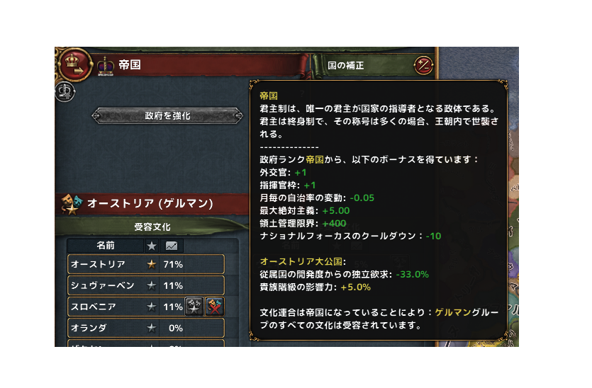 そしてオーストリアは帝国級かつ皇帝なので以下のバフを得る。