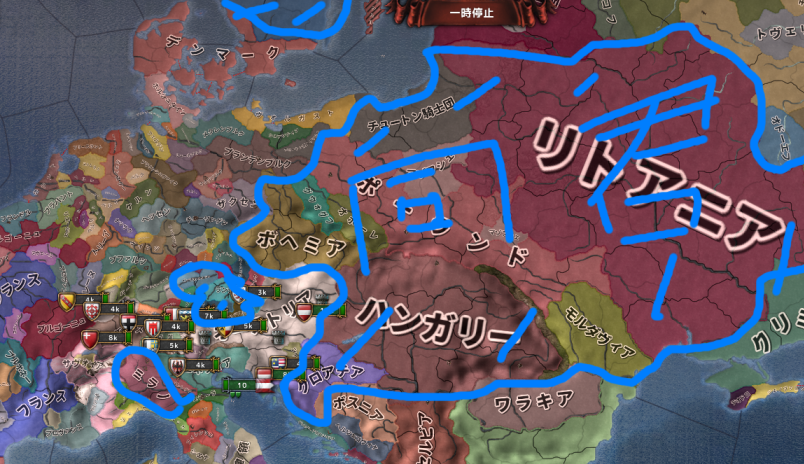 本プレイではオーストリアー>フランスー>サルデーニャピエモンテー>フリースラント(オランダ)ー>神聖ローマ帝国