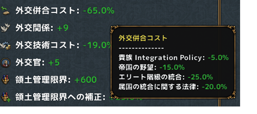 特に外交併合-15%が強く後述するがいろいろ合わせて最高で【外交併合コスト-95%】を達成可能だ。