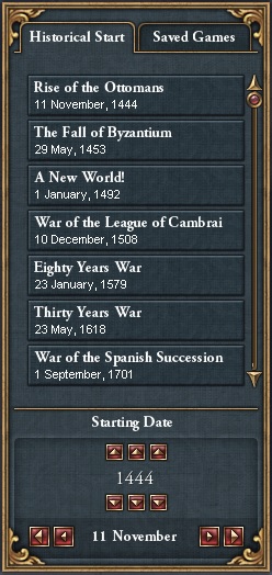 あなたは西暦1444年11月11日から西暦1820年12月31日の間で任意の日付での開始をゲームに対して設定する事ができますが、