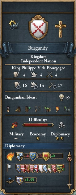 かつその下ではブルゴーニュの現在の技術レベル:統治16、外交14、軍事17 について考えに入れることが出来ます。