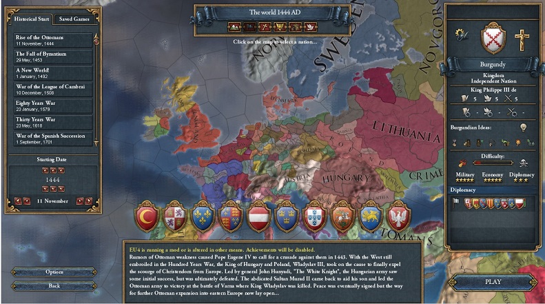 ヨーロッパ・ユニバーサリスIVのアイコンをクリックすると、起動前画面が現れることでしょう。