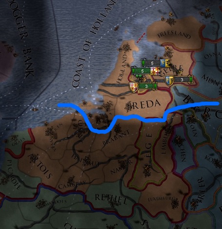 あとそれからこれは少し大事な話。実際のネーデルラント17州の名前とこのゲームでのプロヴィンスの名前が若干違うけど17州という数は同じだよ。そこで数に重きを置いた朕は史実では南部10州に含まれるけどアントウェルペンを北部に含めて無理やり便宜上7、10に分けてるよー。北部6州、南部11州とかいう言葉を使いたくないがためです。許してちょー