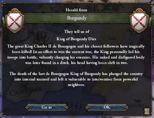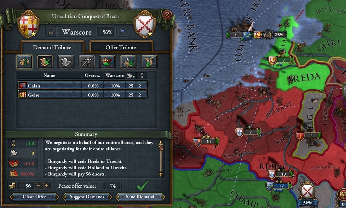 1482年、シャヤカ=ハーンに使えし従順なるユトレヒト市民たちはフランスと共に再びブルゴーニュ公領に侵攻した。このブルゴーニュの危機を見て周辺のヨーロッパ列強は次々とブルゴーニュに宣戦した。イングランド、スペイン、スウェーデン、オーストリア。最早袋叩きである。ブルゴーニュ公国からZeelandとNamurを割譲させた直後にそれは起こった。ブルゴーニュ公が崩御したのである。このブルゴーニュ公が有していた土地はフランスとオーストリアとの間で分割され哀しき袋叩き戦争は幕を下ろしたのであった。またこの頃からシャヤカ=ハーンはネーデルラント北部7州の直轄統治を、南部10州には各5州ずつの従属国を置く統治体制を模索し始めていた。