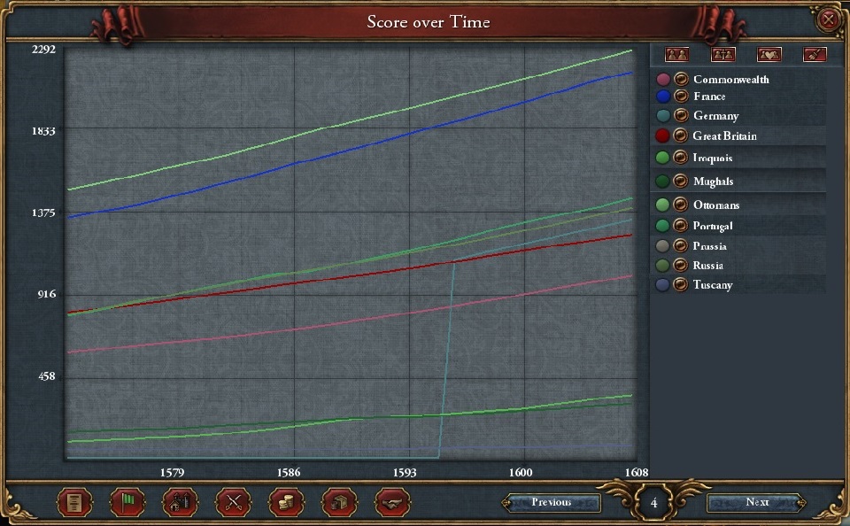 ゲームを1700年まで進めてみるとAI操作にも関わらず陸海が1位に上り詰めていたのである。
