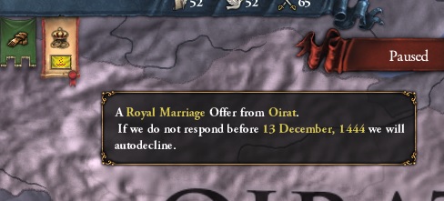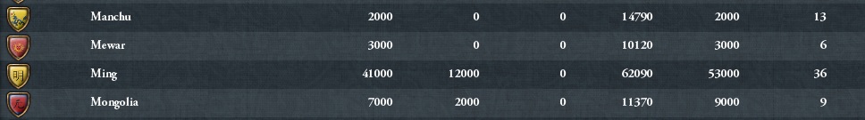 ※満洲軍とオイラト軍がモンゴル領内で戦闘し満洲軍が1、2度オイラト軍を敗走させたら頃合い。今まではオイラトが圧勝するケースも多かったため2国以上がオイラトに宣戦しなかった場合は諦めだったが、verUPによる満洲強化の唯一の功がここである。2国の戦力比は五分五分になった。