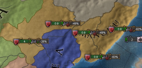 属国化しても以前の対満洲戦争によるマイナス感情は引き継ぎますからね。仕方ないです。満洲は早い軍事技術の上昇と豊富なマンパワーを持っているので独立戦争を仕掛けられるのが怖いですね。こちらは常に関係改善の外交官を張り付けて早期併合を目指しましょう。