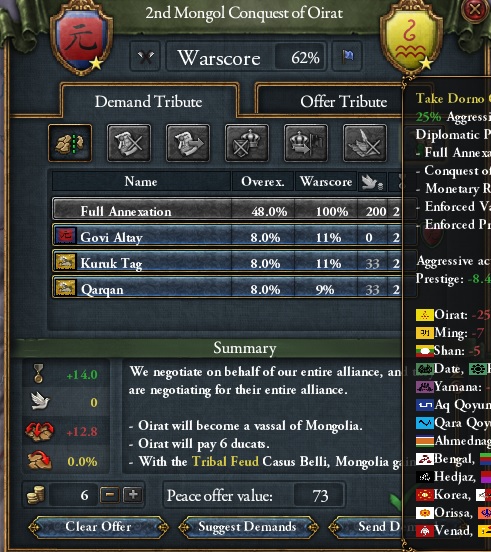 割譲させたいのは山々でしたが、今回の戦争は遊牧民CBを使用していないためAEの上昇を恐れてのことです。統治点も満洲征服の方に先に割きたいのでこのたびの征服は断念しました。