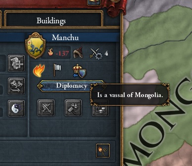 おや?もう満洲を属国化できるようです。やはり朝鮮に2プロビ取られたのは吉と出ましたね。なお遊牧民CBは属国化を要求してもAEの上昇率を下げてくれるみたいですね。それでは属国化と賠償金で和平です。