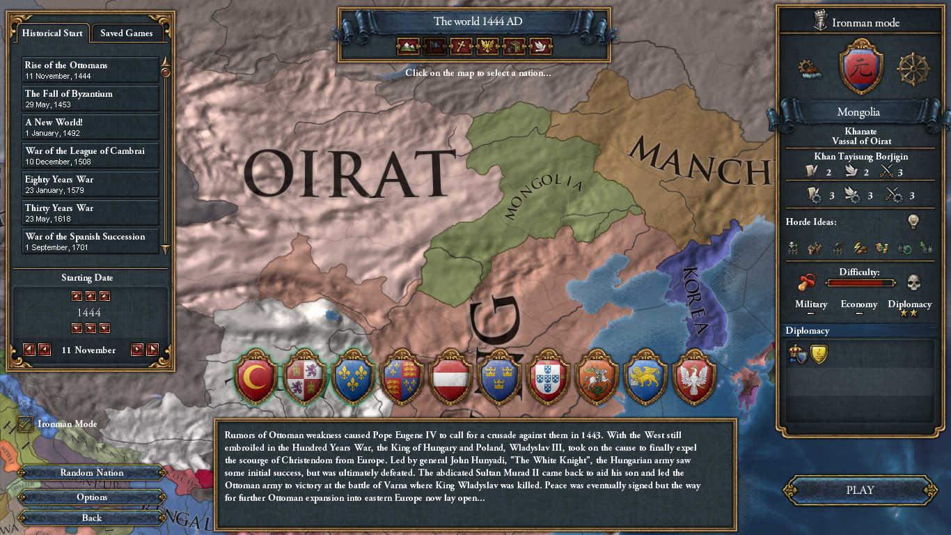1444年ゲーム開始時、モンゴルはオイラトの属国となっています。先ずはオイラトからの独立を目指します。オイラトからの独立に成功した後は朝鮮、チベットと同盟して満洲方面→オイラト方面の順に勢力圏を拡大していき再び全北方遊牧民の王へと返り咲きましょう。序盤は息をついている暇はないので借金を抱えてでの戦争は禁物です。詳しくは以下!
