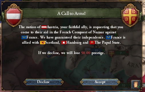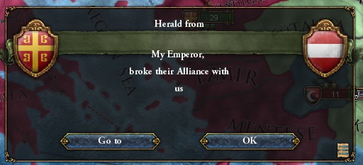 オーストリアはついて来てくれたのね。もうオスマンとの国境間の距離も離れすぎてるしライバル指定も外れてたからてっきり来ないもんかと思ってたよー。フランスとの同盟が成立したら裏切られるということも知らずに。可愛そうね(ゲス顔)