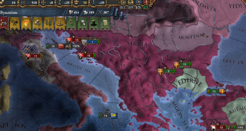 ここまでこれば最早オスマンは脅威ではないでしょう。順当にアナトリア征服を続けます。また今頃思い立ちましたがVer1.7からは和平期間が大幅に延長されたのでアナトリア方面だけでなく東西両方面に交互に侵出するべきでした。ヴェネツィア遠征も同時に行っていきます。