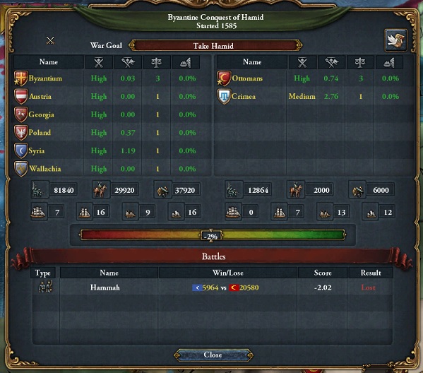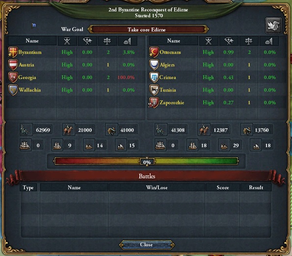 申し訳ございません。それは私のミスでございます。この時点で開始から150年経ってしまいカラマン侯国のコア州も2州だけとなってしまいましたので自力でコア化しても大差なかったかもしれません。この戦争でカラマン侯国のコア州を全て返還させますので終戦後に即刻外交併合したい次第でございます。
