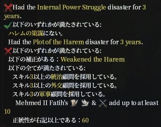 そうでない場合はこれに加えてハーレム国難発生させてないかハーレム国難を3年耐える必要があり、さらに正統性60、スキル3以上の顧問、統治者の能力和が10以上である必要があります。