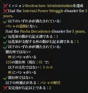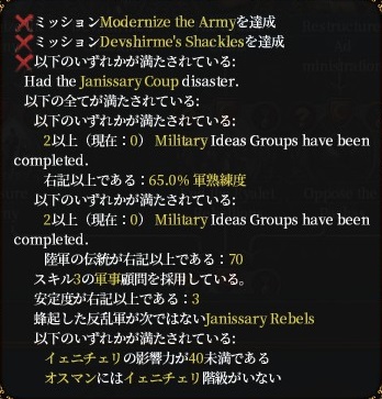 2についてはこの3つのミッションに関連していて、そのミッションをクリアするごとにディシジョンが1つ使える。そのディシジョン(イェニチェリとの対峙)を使うことにより、tur_fight_against_the_janissaries_1~3_flagがセットされ、イェニチェリを粛清できます。3回行うことで達成となります。