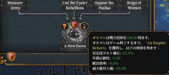 政府改革に関してはプレチですがミッション Mansure the Armyか新旧オスマン政府以外でミッション Fate of the Devshirmeを達成するとtier5を無償、ミッション Seize Caliphateでズィンミールート(神秘主義ルート)に行った場合の最後のミッションでtier4の改革を無償で貰えます。
