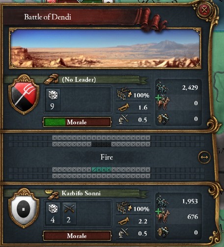 1458年、帝国内で最も貧しい地域であるデンディの民は増税と難民に対する怒りを爆発させ、反乱の狼煙を上げた。王弟カービフォは「弓射訓練だ」と鼻で笑い鎮圧にあたったが、舐めてかかったのが仇となり一度は首都ガオに逃げ帰る始末であった。