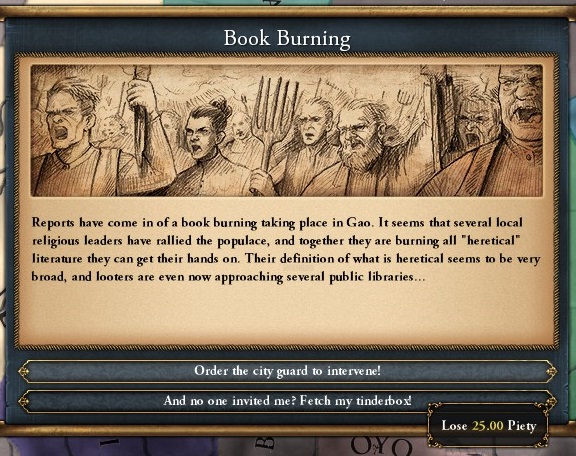 1461年、首都ガオで焚書騒ぎが起こった。分離派の活動禁止を指揮する宗教指導者が民衆に異端の書の焼却を呼びかけたのだ。群衆は帝立図書館にも迫っているという。そこには数々の技術書が保管されていた。スンニ・ダウドは命じた。
