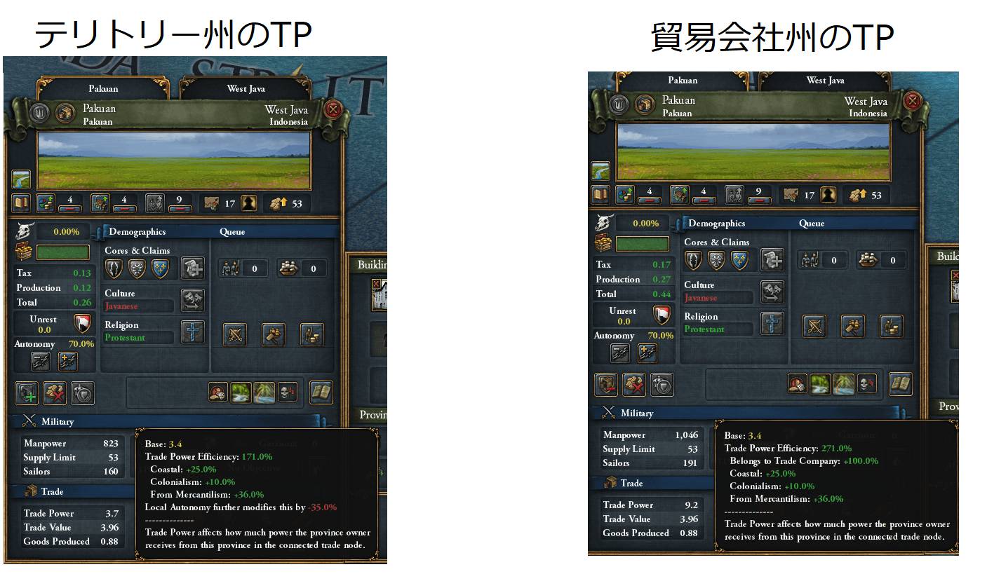 従ってGoverning_Costを無視すれば、貿易会社州はテリトリー州の上位互換*1と考えてよいと思う