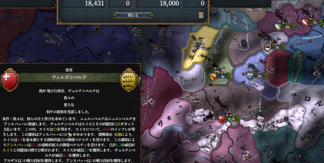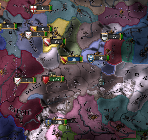 まあ味方にブルゴーニュと愉快な低地諸国がいる上アンスバッハも来るらしいのでスイスは占領しまくってればOK。