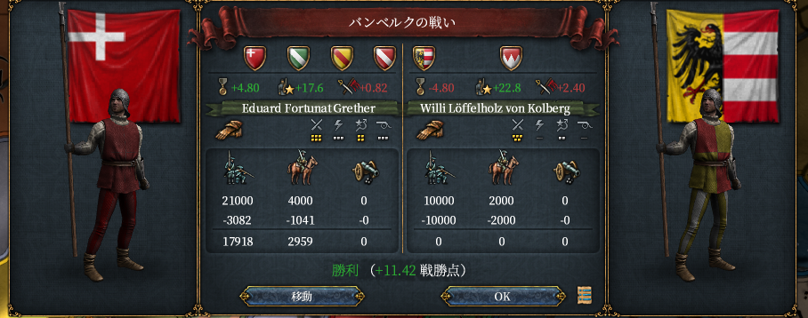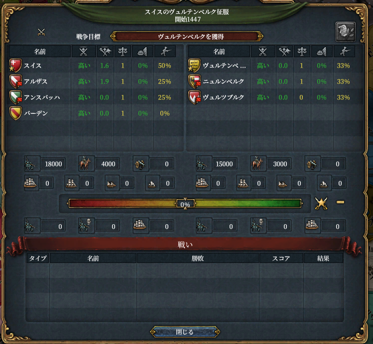 同盟国は先程領土を渡されて(そのあとオーストリアの返還要求に屈したはずなのになぜか)ホクホク顔のアルザスとヴュルテンベルク死すべしとするアンスバッハ。敵同盟国は名前の似ているヴュルツブルクと自由都市ニュルンベルク。ってあれ?敵の軍が気づいたら12kまで減ってる…。