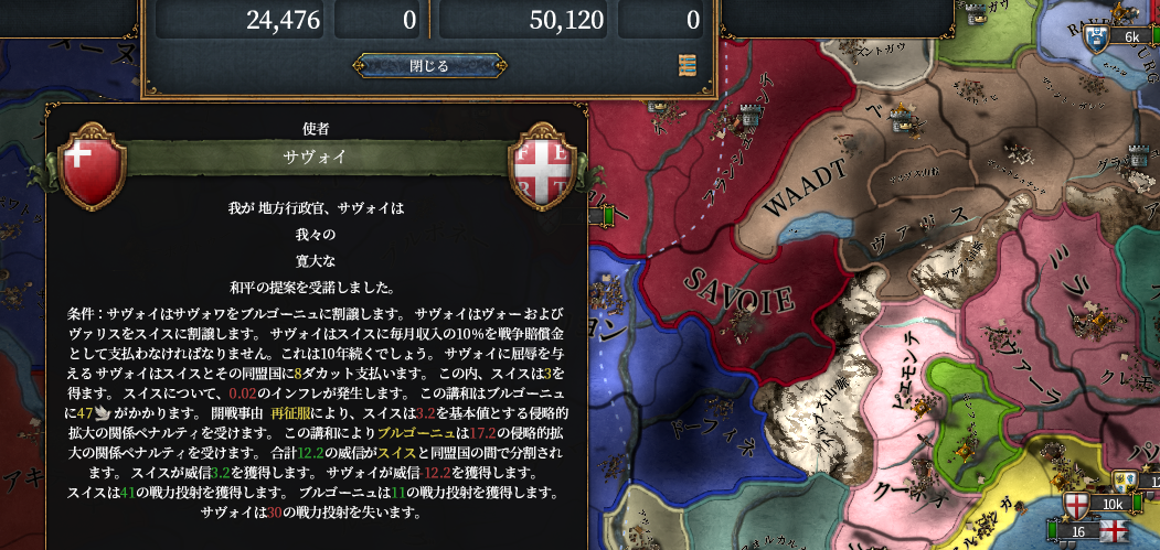 スイスは旧領ヴァリスとWaadt、ブルゴーニュはサヴォアを獲得しサヴォイは名実ともにイタリア諸侯へと落ちぶれました。そういえばヴュルテンベルクの件ですが、