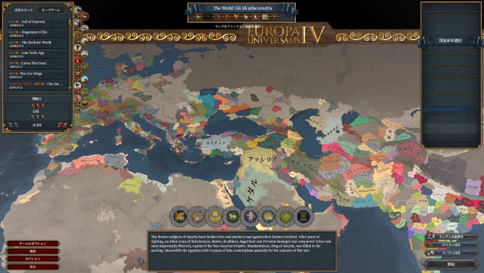 ver1.30.6 DLCすべて Imperium Universalisと専用の日本語化MOD ローマ建国紀元145年(紀元前609年のはずですがシナリオでは紀元前612年)8月10日開始