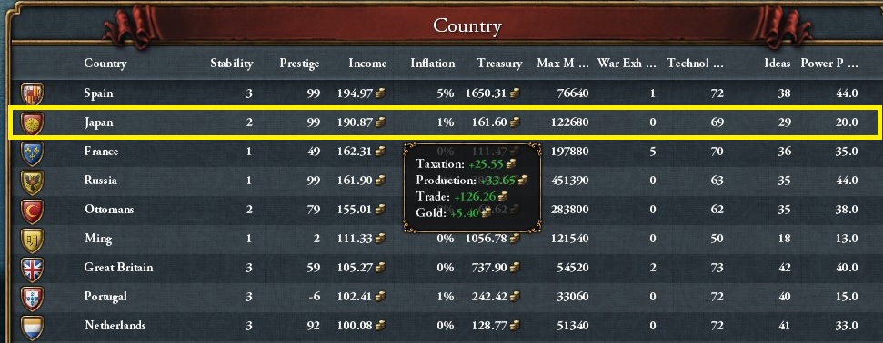 世界で日本だけが信仰している「神道」の効果(士気+10%)と、日本のナショナルアイデアは前述のとおり非常に強力です。