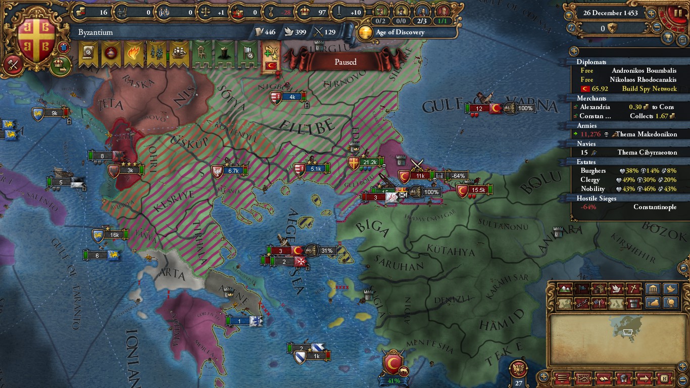 2戦目でブルガリアを奪還し、オスマンをヨーロッパからたたき出しても情勢は予断を許さない。ヴェネツィア・ジェノヴァはエーゲ海に居座って虎視眈々とギリシアを狙っており、ハンガリーやポーランドも南下して襲ってくる可能性がある。小アジアではオスマンに代わってマムルークが台頭し立ち塞がるだろう。モスクワ・オーストリア・ハンガリー・ポーランドあたりは同盟国たりえるかもしれないがここぞという時で役に立たないことも多いので依存は避けたいところだ。