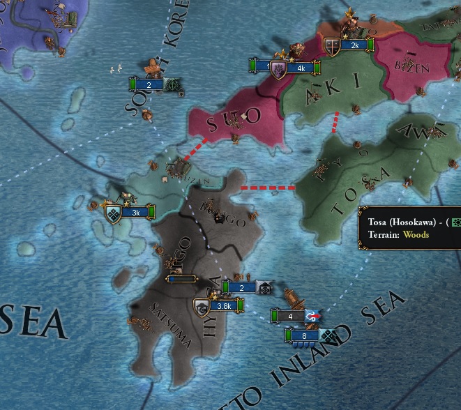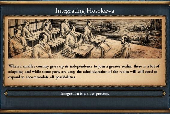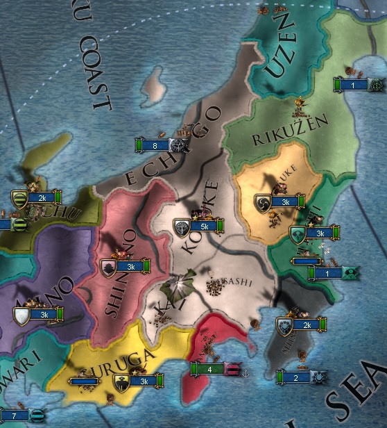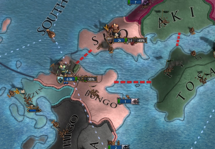 基本方針としては1プロビの弱小大名をちまちまと外交併合しても、ペナルティが加算されるだけなので多少リスクはあるが細川、大内、山名等の強豪の併合を進めていく方向である。
