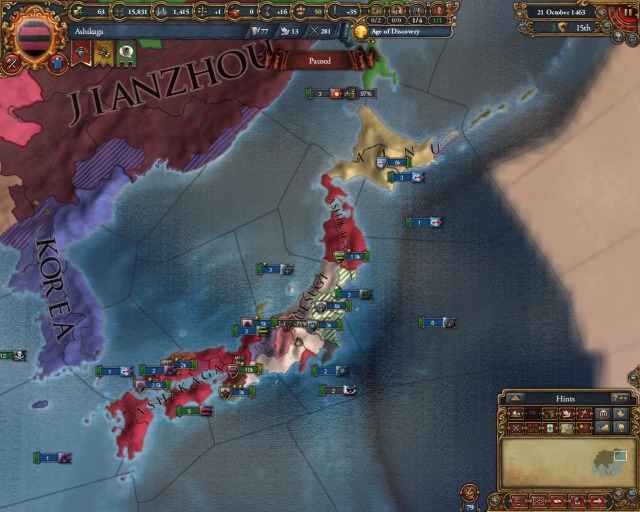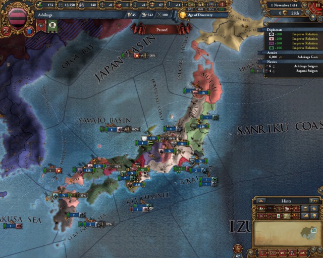 実際は足利は開始時やることはほとんどない。戦争ができないからだ。大名に対しては宣戦ができない。外は超大国明の勢力圏。現状はアイヌぐらいしか攻められないが、大義名分なしで仕掛けるほどうまみはない。