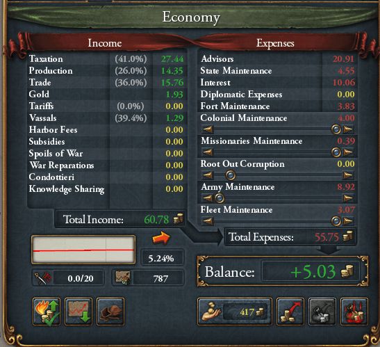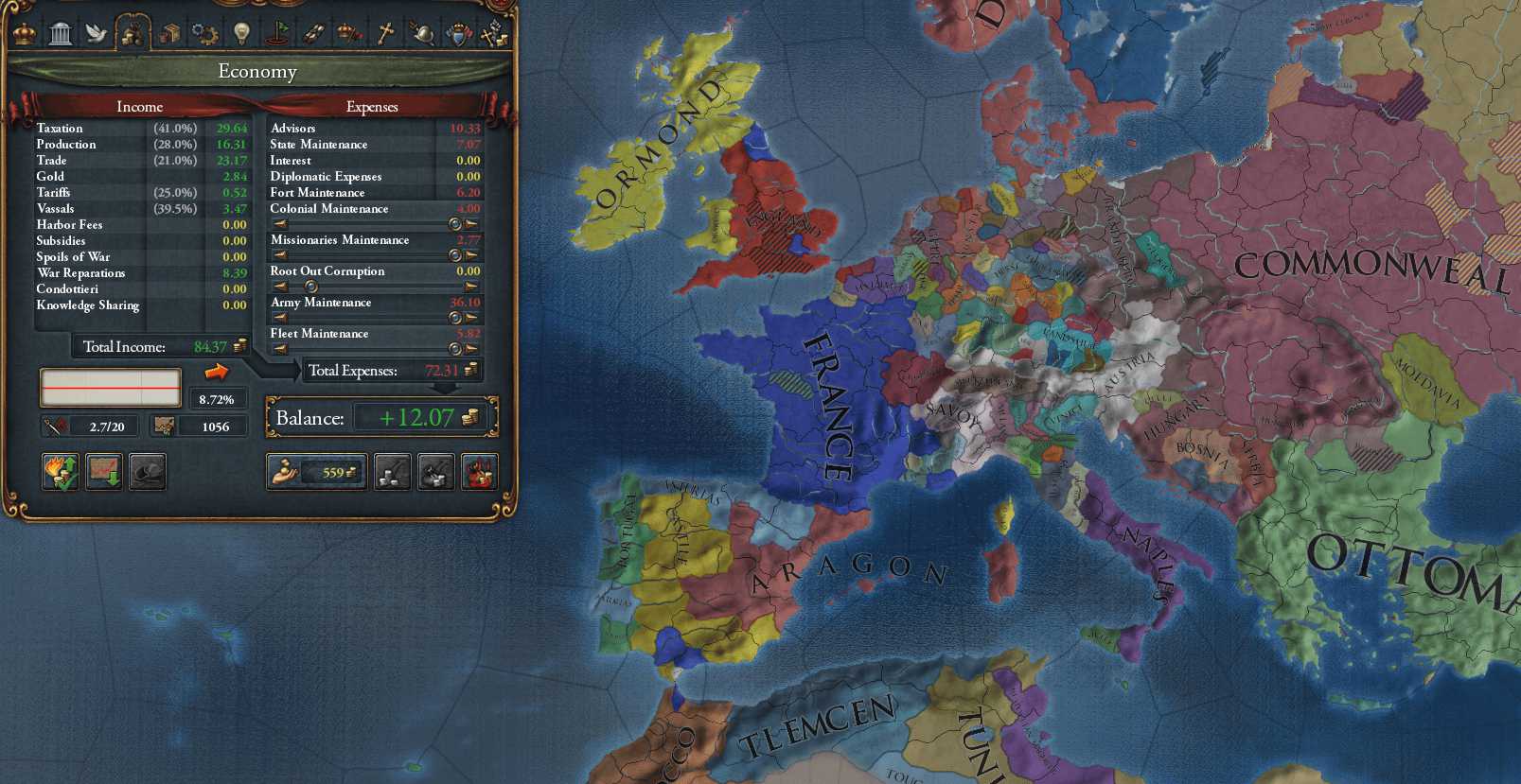 DEVに対して収入が低い。理由としてはステート配分の失敗、建造物がない、交易収入が低いなどが考えられる 軍量は①Ming②Ottomans③Commonwealth④Muscovyに次ぐ5位の67kでやっと6位のHRE皇帝Ausria(53k)を上回った