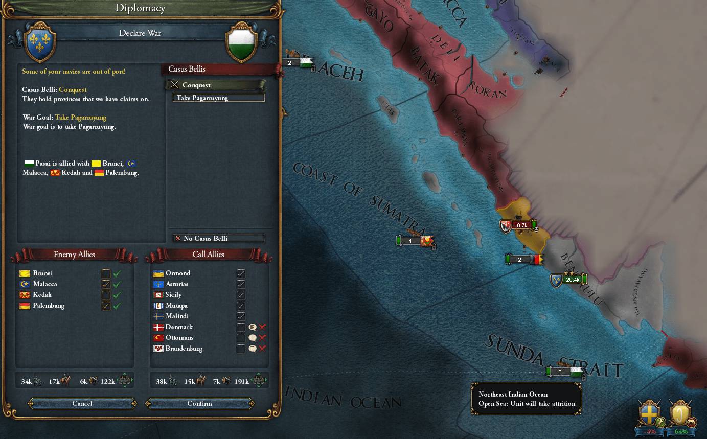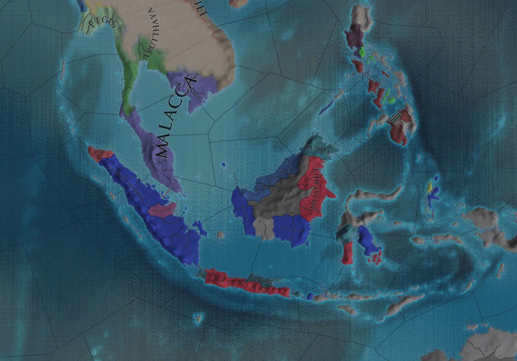 陸上部隊は予め上陸させておいた。Malaccaも征服するつもりで共戦国に指定したが、敵陣営の海軍が予想より多く海峡の渡河ができなかった 敵陸軍総数57kに対して準備したのは20k強(輸送中に損耗していた)だったが、AIがあまり連携せず戦力を逐次投入してきたためさほど苦戦しなかった 余談だが世界地図を知っているプレイヤーであればこそ、未知領域の敵相手でも目算を立てられるものの 実際に現地で戦う兵士からすれば「正気の沙汰ではない」と感じても仕方ない