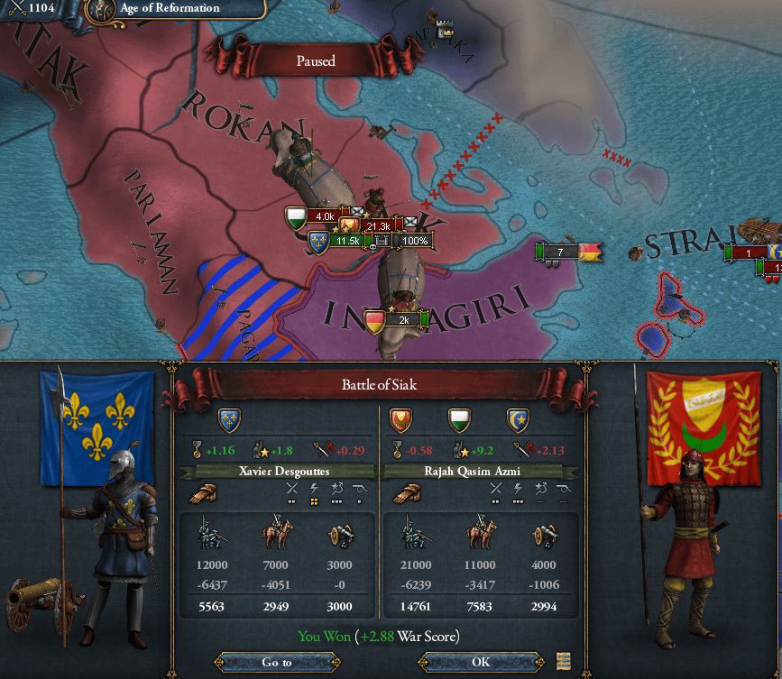 1535/02 密林地形の要塞(占領済み)に渡河してきたBrunei軍11kを殲滅。自軍(22k)の被害は1000にも満たない圧勝だった