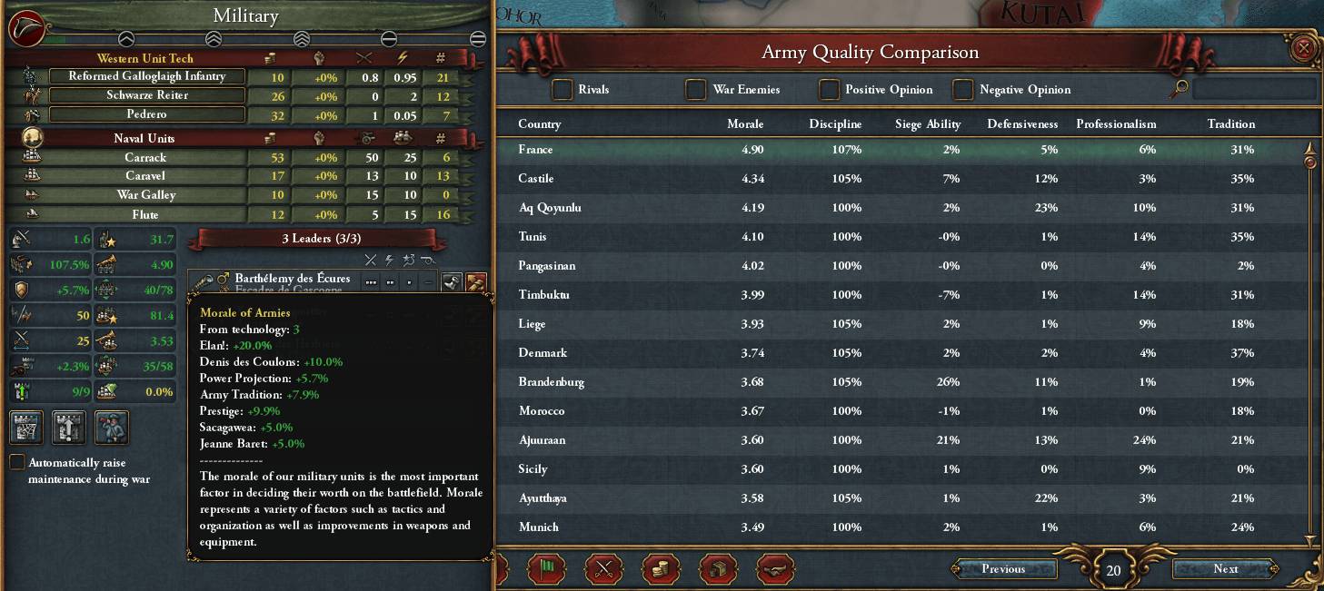 やたらと海軍伝統が高く(95.6)、機動はともかく総Pips数ではかなり優秀な探検家を獲得した そこまで海戦をしたり艦船を失った覚えもないので、新Verの影響?探検しているから?交易保護?(まだ世界一周はしていない) 最近植民国家や海洋交易国家であまりプレイしていなかったため、理由がよくわからない 陸戦はそれなりにこなしているはずだが、陸軍伝統は43.4。記憶にある限りでは陸軍伝統が海軍伝統の半分以下なんて初めての経験。逆にしてほしい