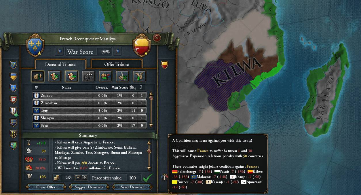 1547/06 Kilwaに宣戦布告。敵同盟のMombasaを共戦国に指定したため、Ajuuraanも参戦