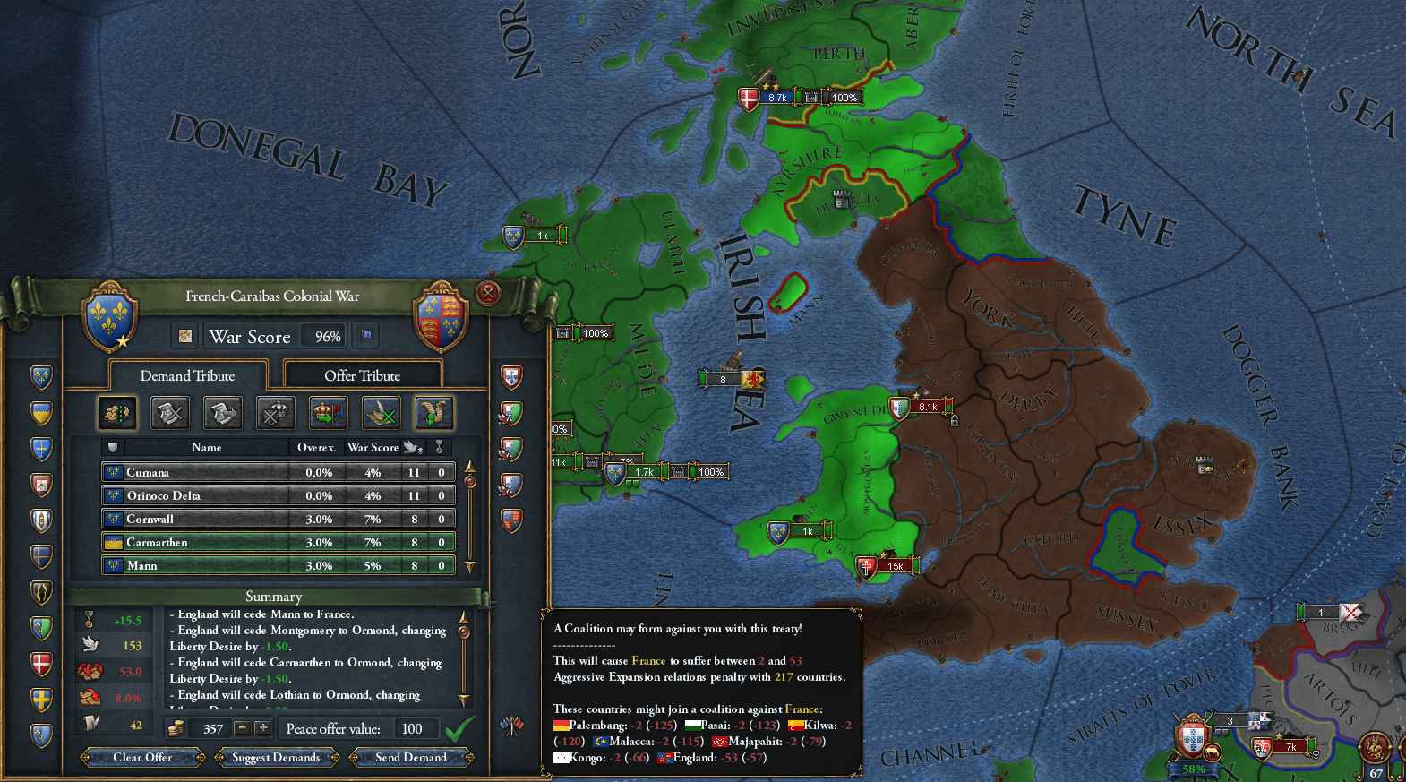 ブリテン諸島の州を領有しているのは①England②Ormond(属国で外交評価+200)③Denmark(同盟国で外交評価+150前後)④France やはりどうあってもScotlandの外交評価が必要だったのか? Ormondのミッションでブリテン諸島の(段階的にだが)全州に対する請求権を得られるので、Englandとの講和時はOrmondに割譲させて最後に外交併合することにした
