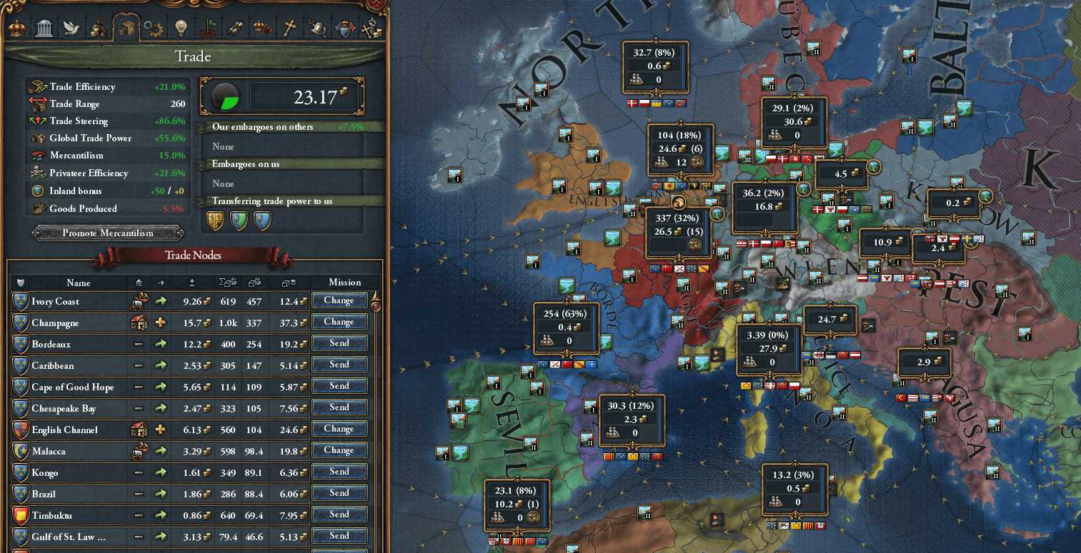 英国海峡/ジェノヴァノードに流出してしまい、せっかくアジア・アフリカから運んできた富をイマイチ回収しきれていない ミッション1-3が達成できておらず、AEが怖いこともあって大ブリテン島南部を征服できていない点が響いている