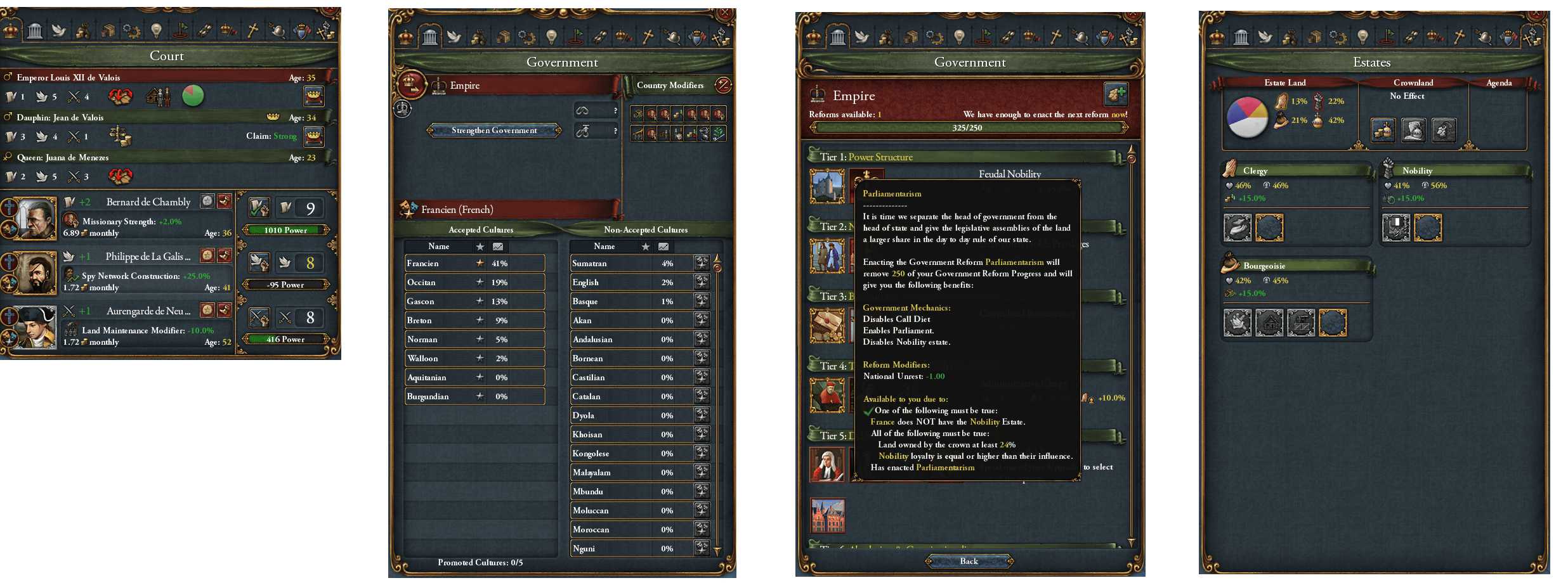(宮廷) 貿易会社に投資したいので顧問費を節約中 (政府) 怒涛の布教強度補正 (政府改革) Tier5を決断できていない。議会制を導入すると階級の方の"Summon the Diet"が利用できないので断念すべきか (階級) 忠誠度と睨めっこしながらEstate_Landの没収でCrownlandの割合を増やしている